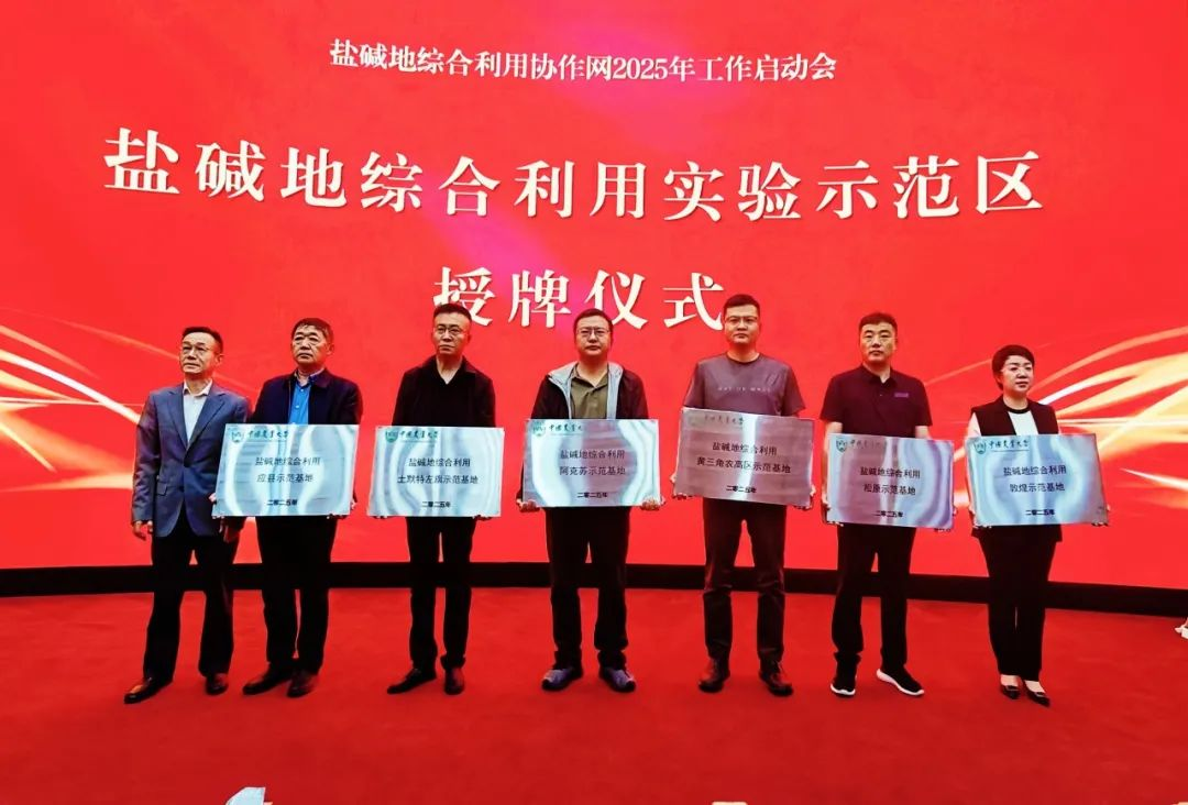 会上,来自科研院所与高校的专家学者围绕盐碱地综合利用的核心技术、治理模式与产业化路径展开深度交流,形成系统性解决方案框架。为发挥成员单位的示范引领作用,推动科技成果在全国盐碱地地区转化,协作网正式授牌黄三角农高区盐碱地综合利用示范基地、阿克苏地区盐碱地综合利用示范基地、敦煌盐碱地综合利用示范基地、松原盐碱地综合利用示范基地、土默特左旗盐碱地综合利用示范基地、应县盐碱地综合利用示范基地六大盐碱地综合利用示范基地。这些基地治理经验丰富、成效显著,此次授牌标志着我国盐碱地治理正从技术攻关迈向规模化应用新阶段。