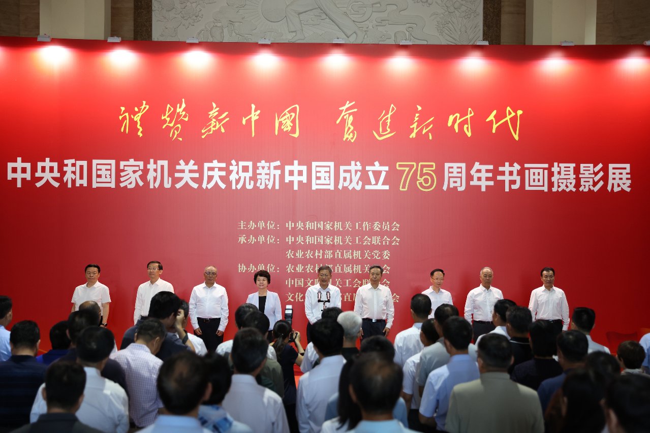 6月25日,“礼赞新中国 奋进新时代”中央和国家机关庆祝新中国成立75周年书画摄影展开幕式在全国农业展览馆举行。中央和国家机关工委分管日常工作的副书记郭文奇出席开幕式并宣布开幕。中央和国家机关工委副书记、中央和国家机关工会联合会主席蔡淑敏致辞,中央和国家机关工委副书记、中央和国家机关纪检监察工委书记王爱文,全国总工会副主席、书记处书记、党组成员魏地春,中国文联党组成员、副主席、书记处书记董耀鹏,农业农村部党组成员、副部长马有祥,文化和旅游部党组成员、副部长饶权,中央和国家机关工委委员、组织部部长闪伟强,中央和国家机关工委委员、基层组织建设指导部部长张璐等出席,中央和国家机关各部门机关党委、工会组织负责人,中国美术家协会、中国摄影家协会、中国书法家协会负责人以及中央和国家机关干部职工和参展作品作者代表参加。