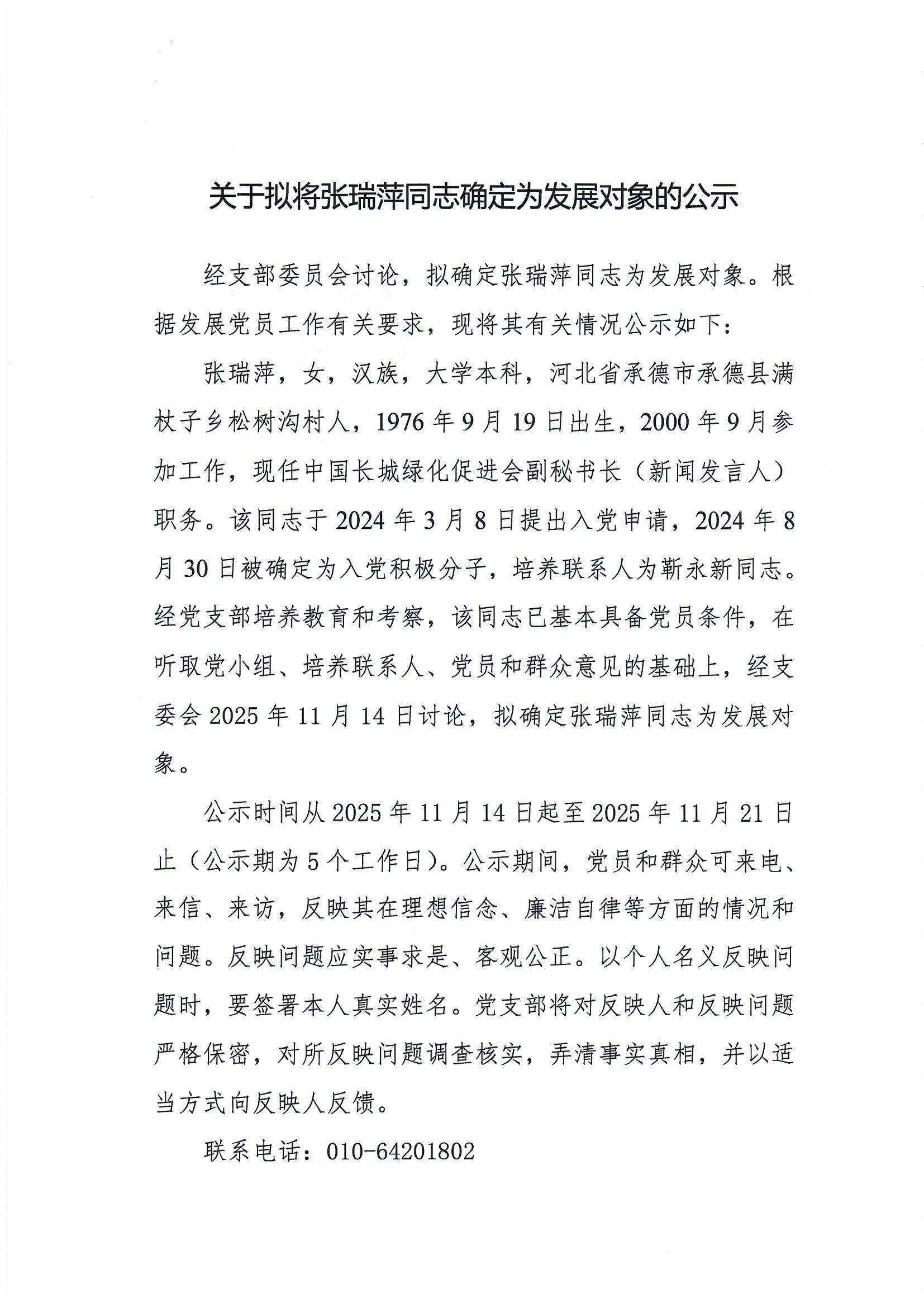 中国长城绿化促进会党支部关于张瑞萍同志转为预备党员的公示