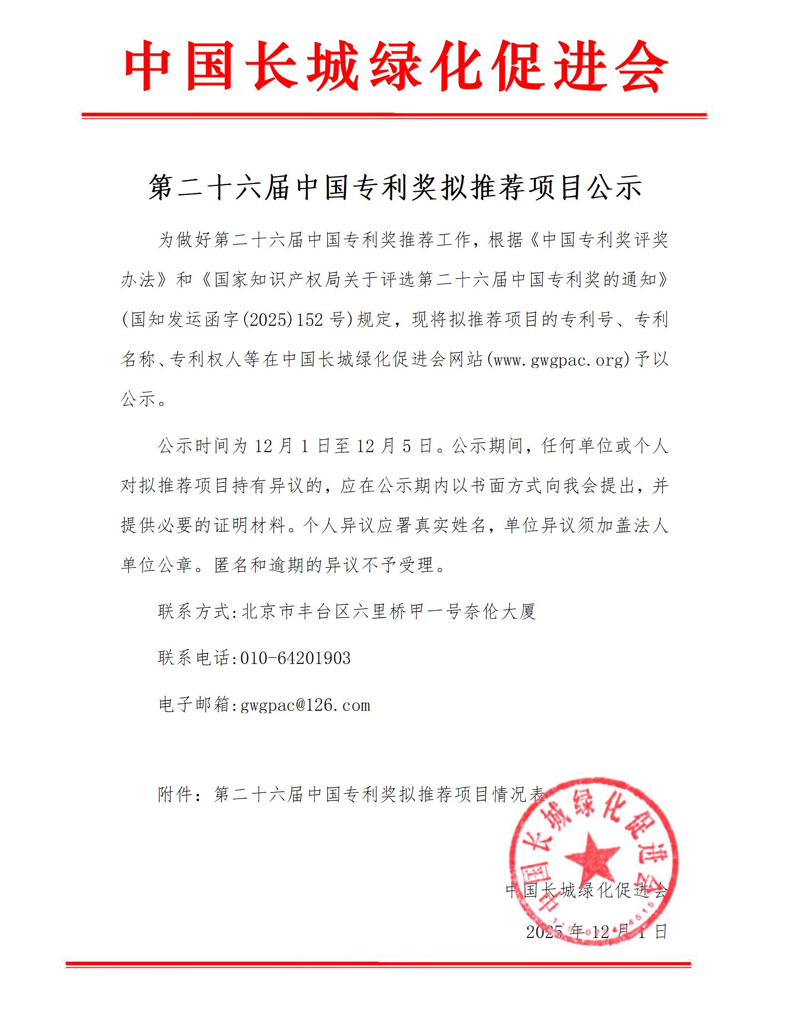 第二十六届中国专利奖拟推荐项目公示
