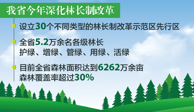 今年以来,我省深化林长制改革,设立30个不同类型的林长制改革示范区先行区,全省5.2万余名各级林长护绿、增绿、管绿、用绿、活绿,目前全省森林面积达到6262万余亩,森林覆盖率超过30%。林长制改革取得了显著成效,成为新时代安徽改革的知名品牌。