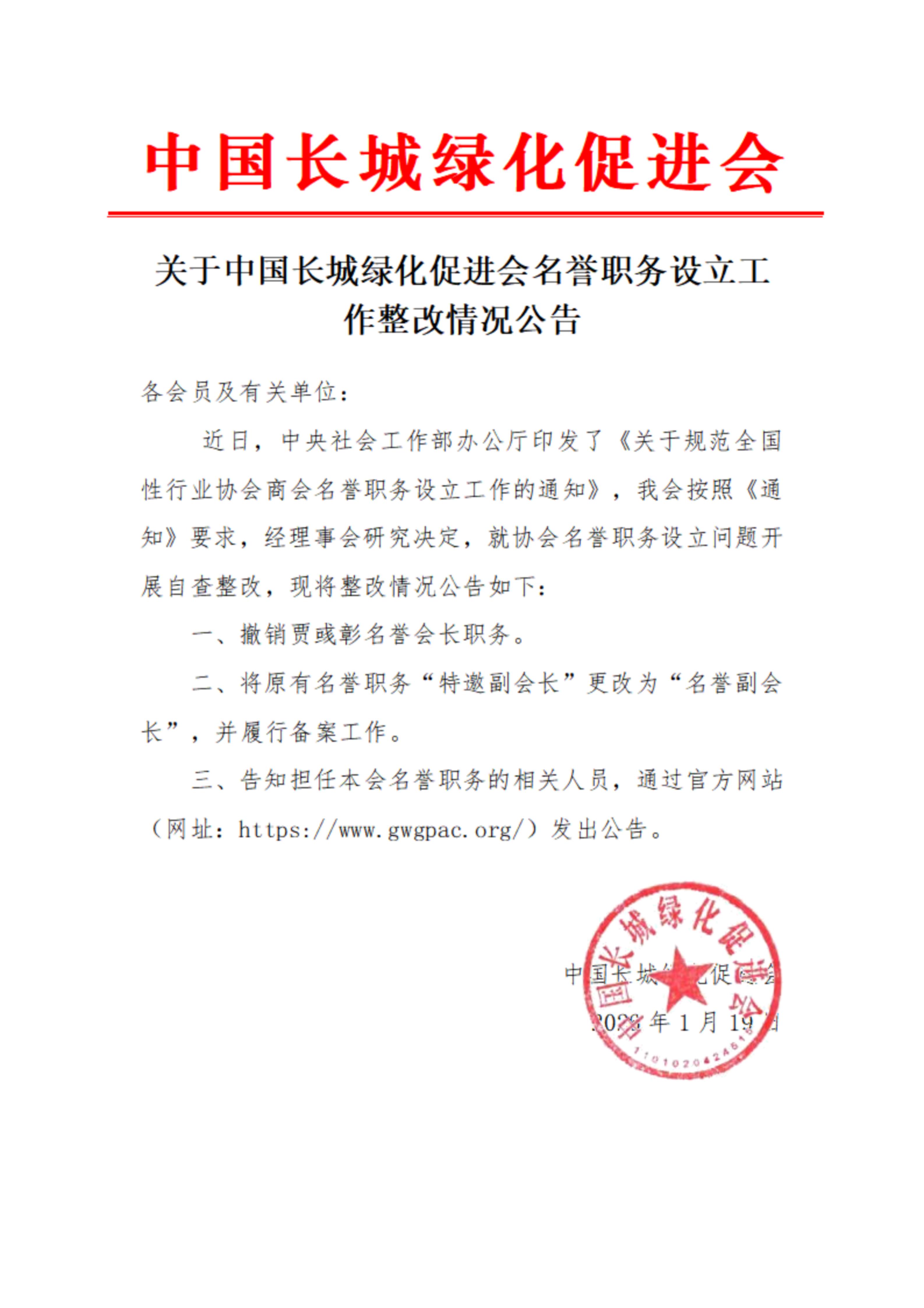 中国长城绿化促进会名誉职务整改公告